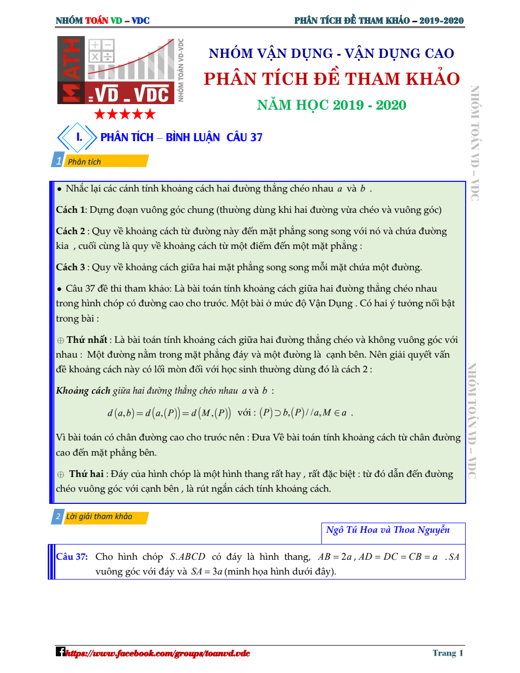 Bài toán góc và khoảng cách trong đề tham khảo THPTQG 2020 môn Toán