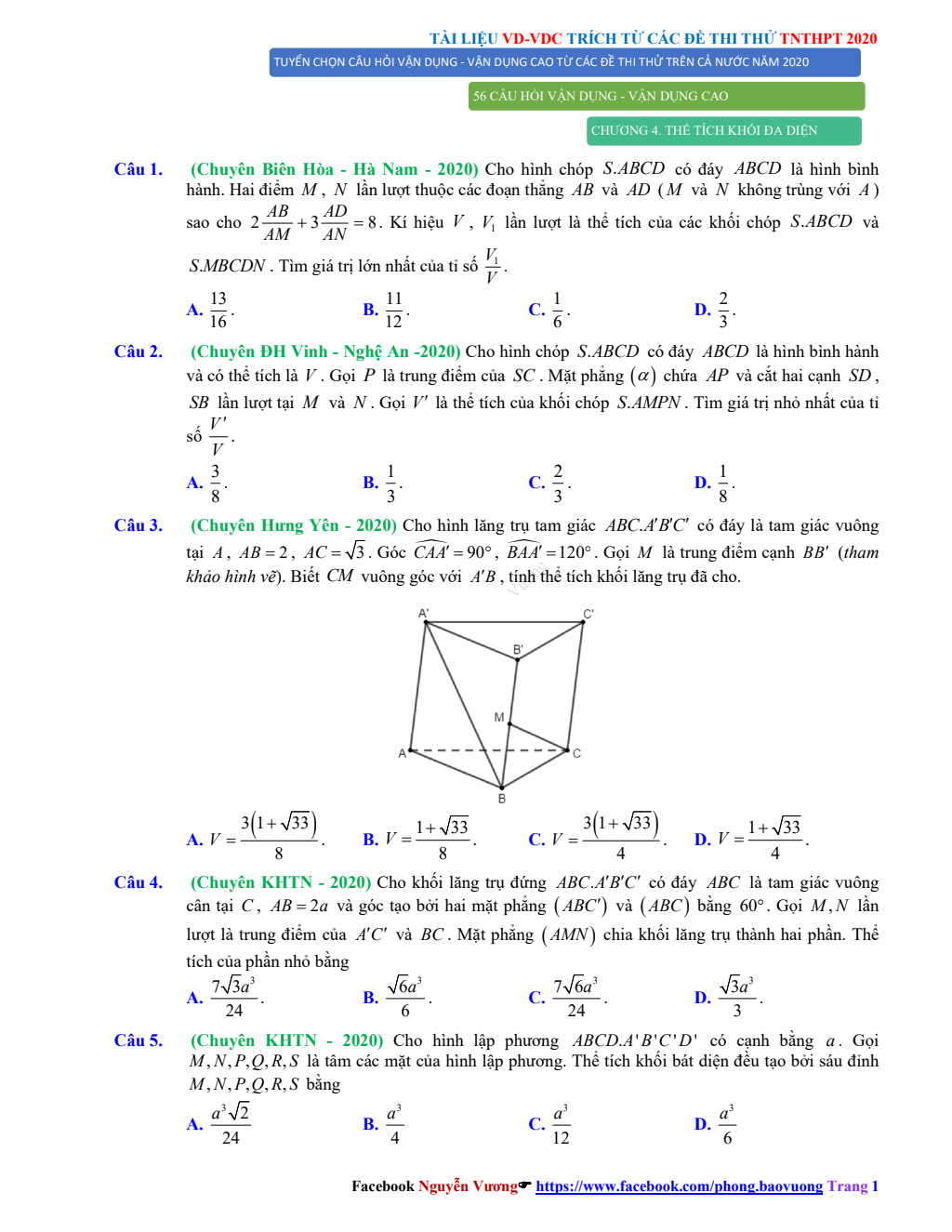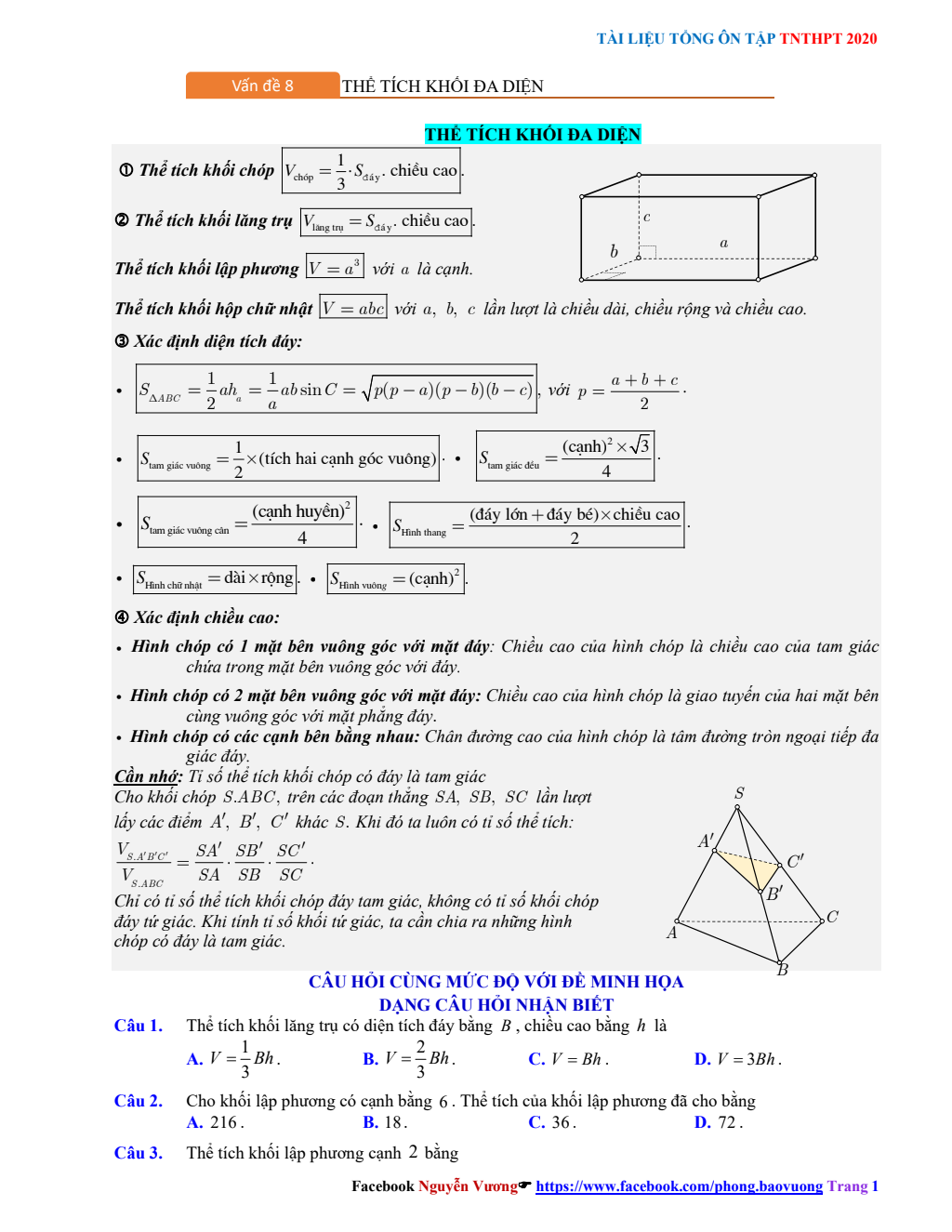 Tổng ôn tập TN THPT 2020 môn Toán-Thể tích khối đa diện