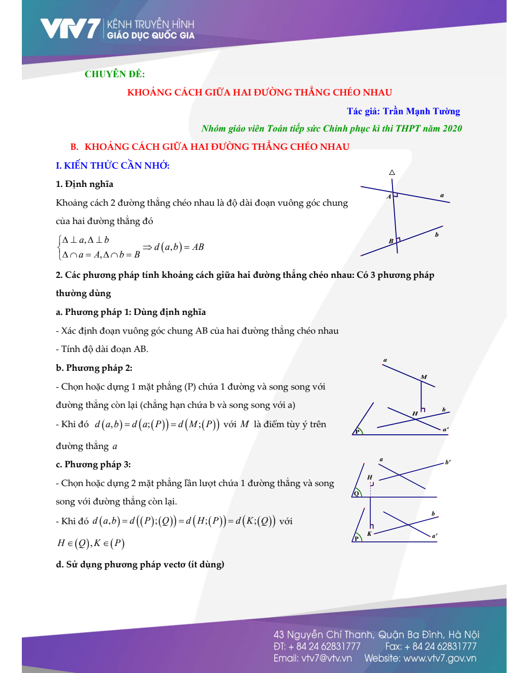 Chuyên đề khoảng cách giữa hai đường thẳng chéo nhau – Trần Mạnh Tường