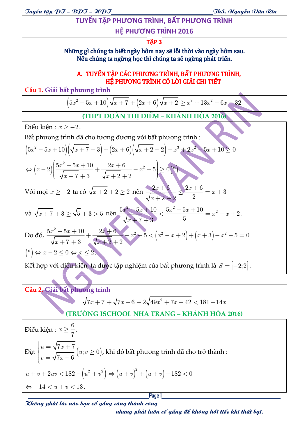 TUYỂN TẬP PHƯƠNG TRÌNH BẤT PHƯƠNG TRÌNH 2016.pdf