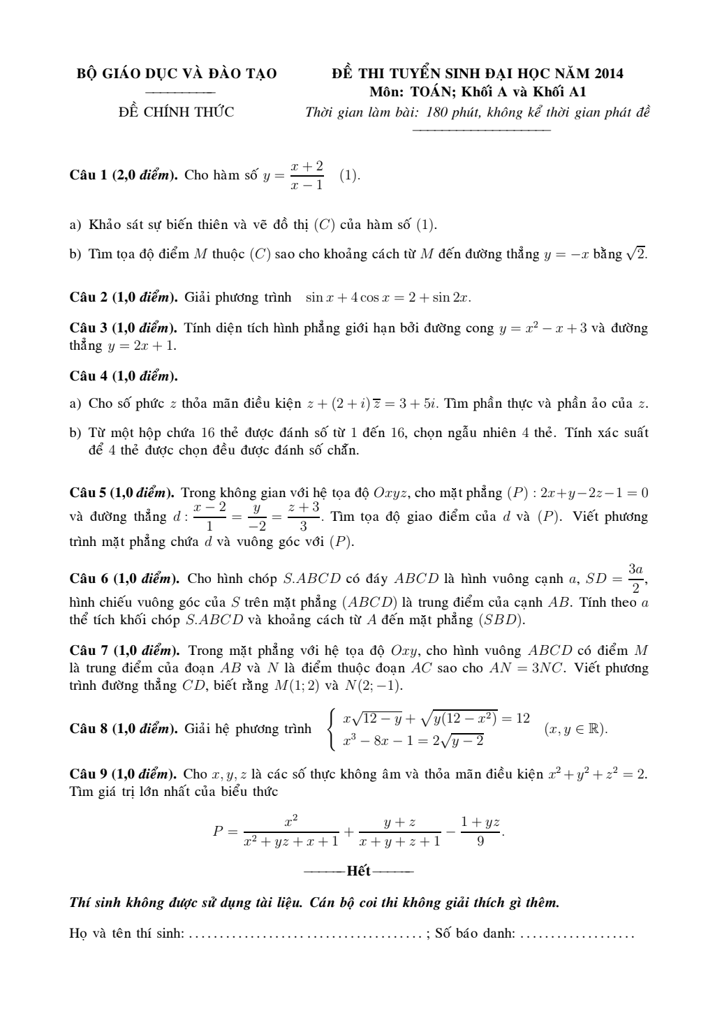 Đề thi và đáp án Toán khối A 2014.rar