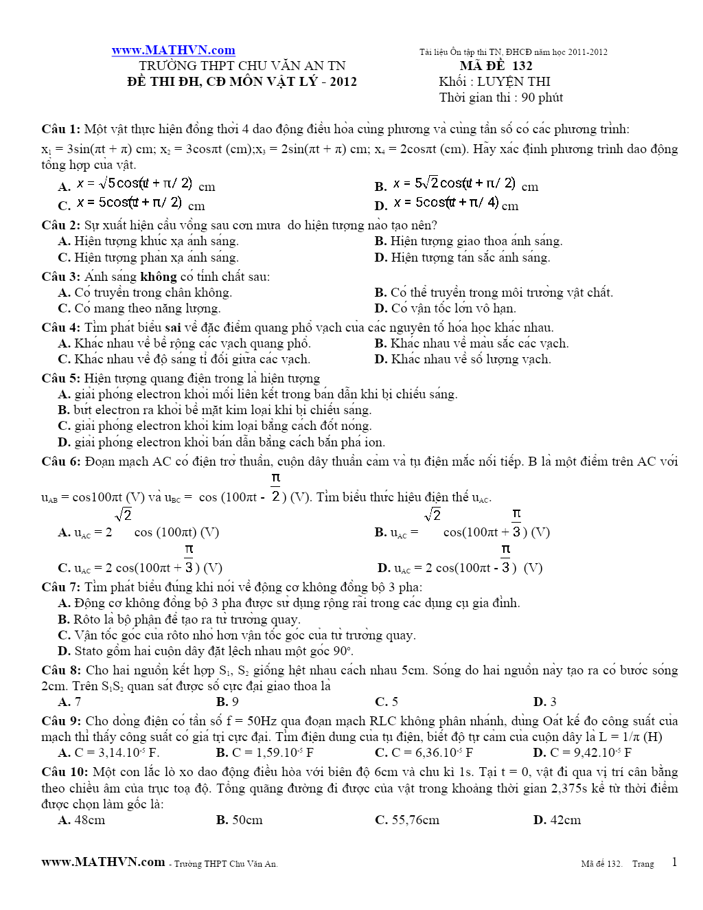 Đề thi trắc nghiệm môn Vật lý ( Ban khoa học tự nhiên).zip