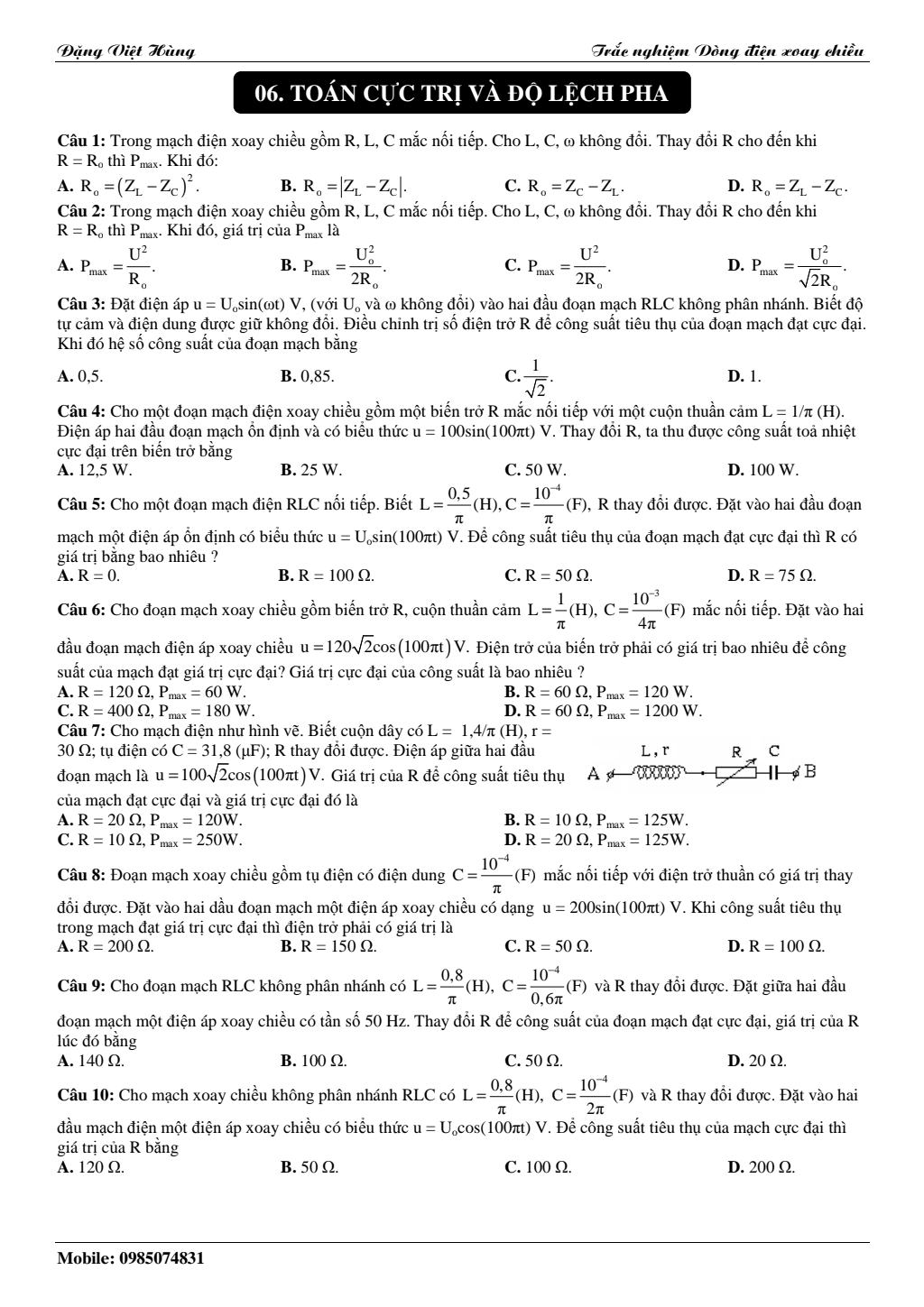 121 câu trắc nghiệm Dòng điện xoay chiều - Toán cực trị và độ lệch pha.pdf