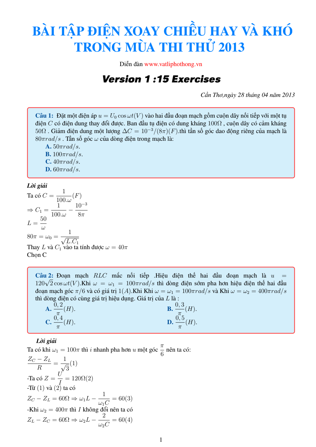 BÀI TẬP ĐIỆN XOAY CHIỀU HAY VÀ KHÓ TRONG MÙA THI THỬ 2013.pdf
