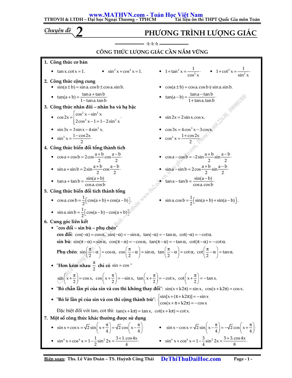 BÀI TẬP PHƯƠNG TRÌNH LƯỢNG GIÁC CÓ ĐÁP SỐ - LÊ VĂN ĐOÀN.pdf