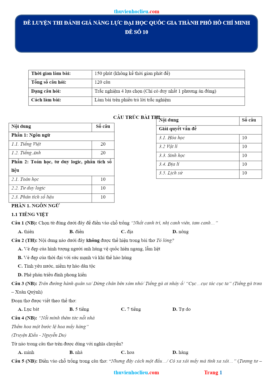 Đề Ôn Luyện Thi Năng Lực 2022 ĐH QG TPHCM Có Đáp Án Và Lời Giải-Đề 10