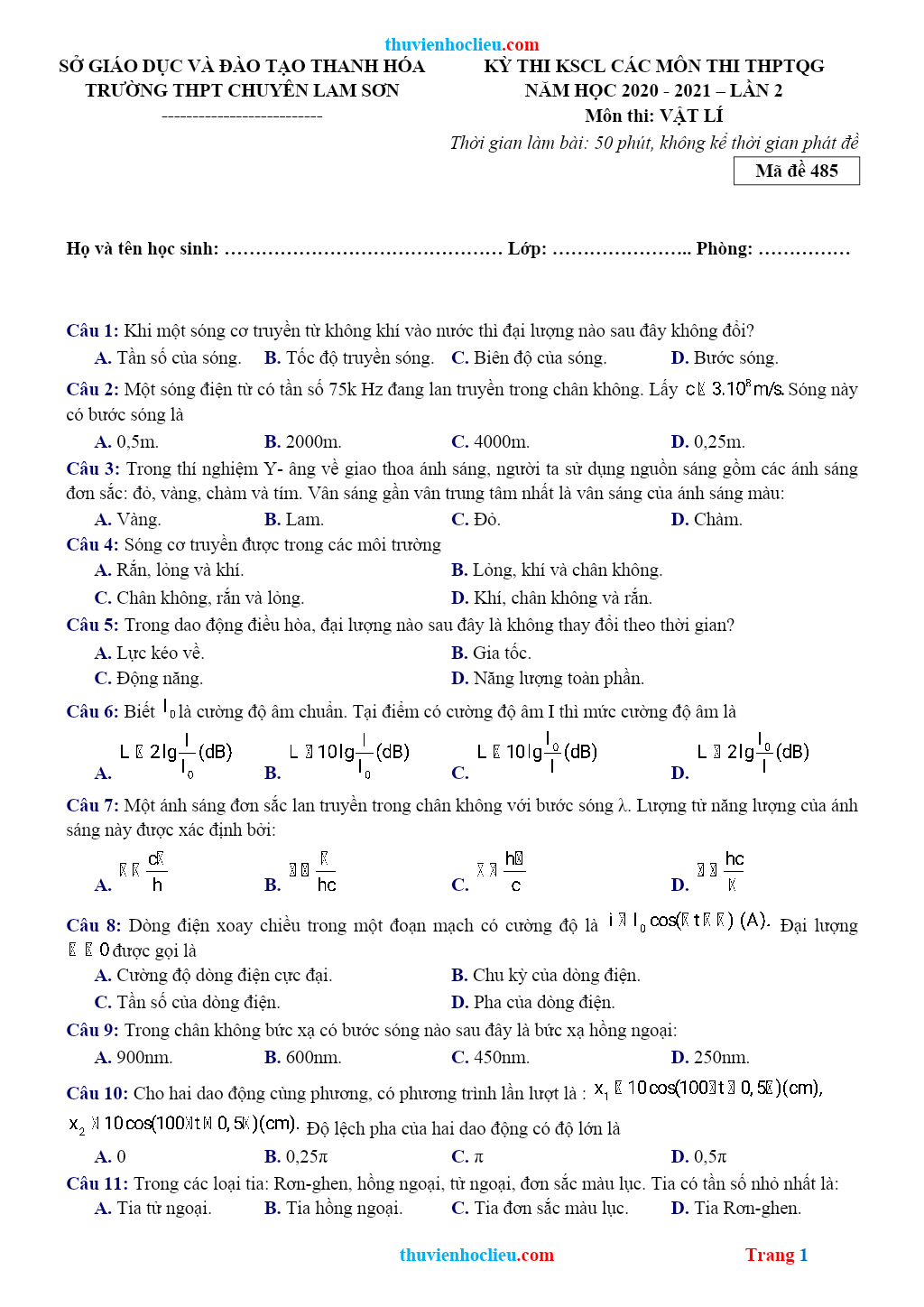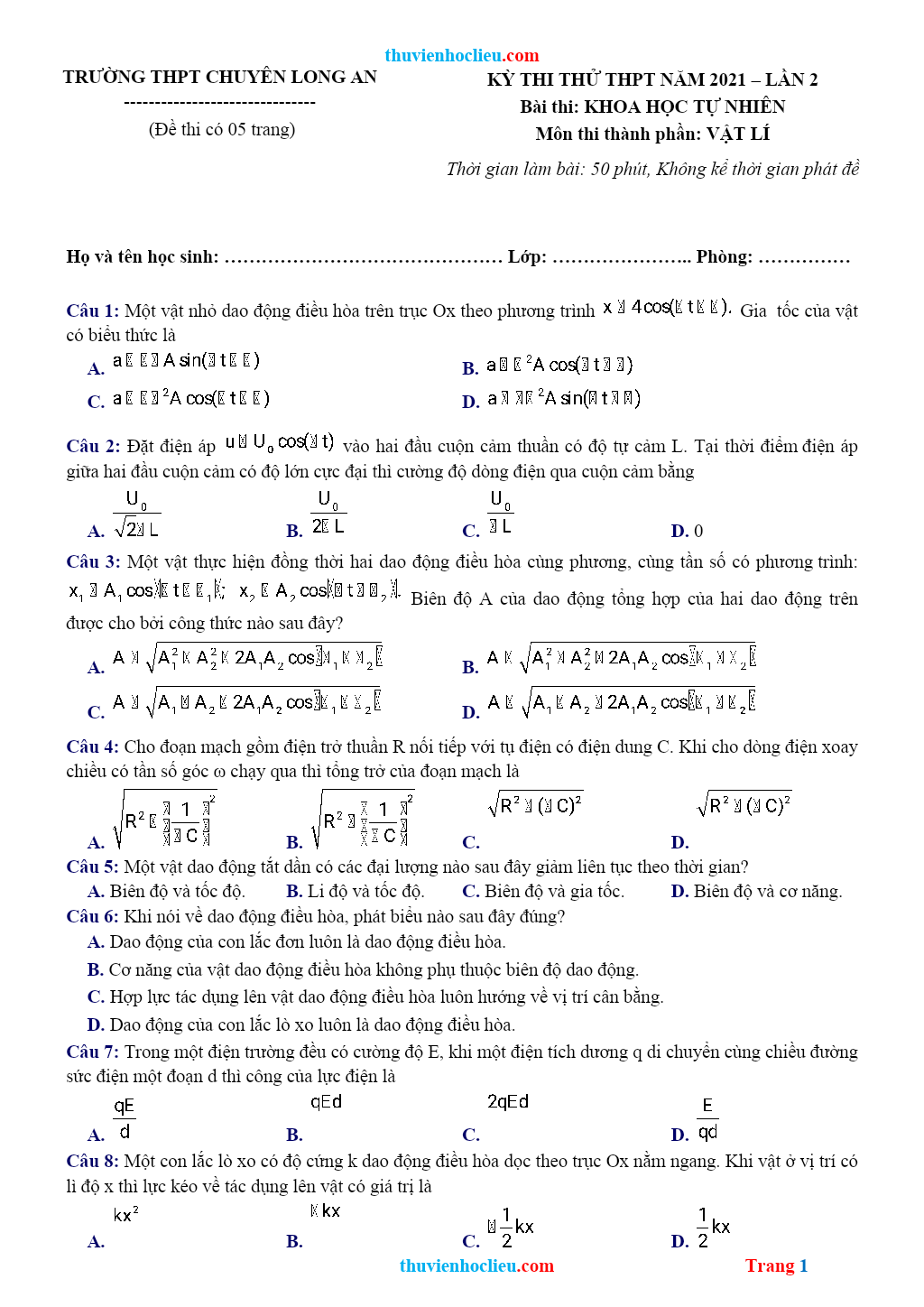 Đề Thi Thử TNTHPT 2021 Vật Lý Trường Chuyên Long An (Lần 2) Có Đáp Án Và Lời Giải Chi Tiết