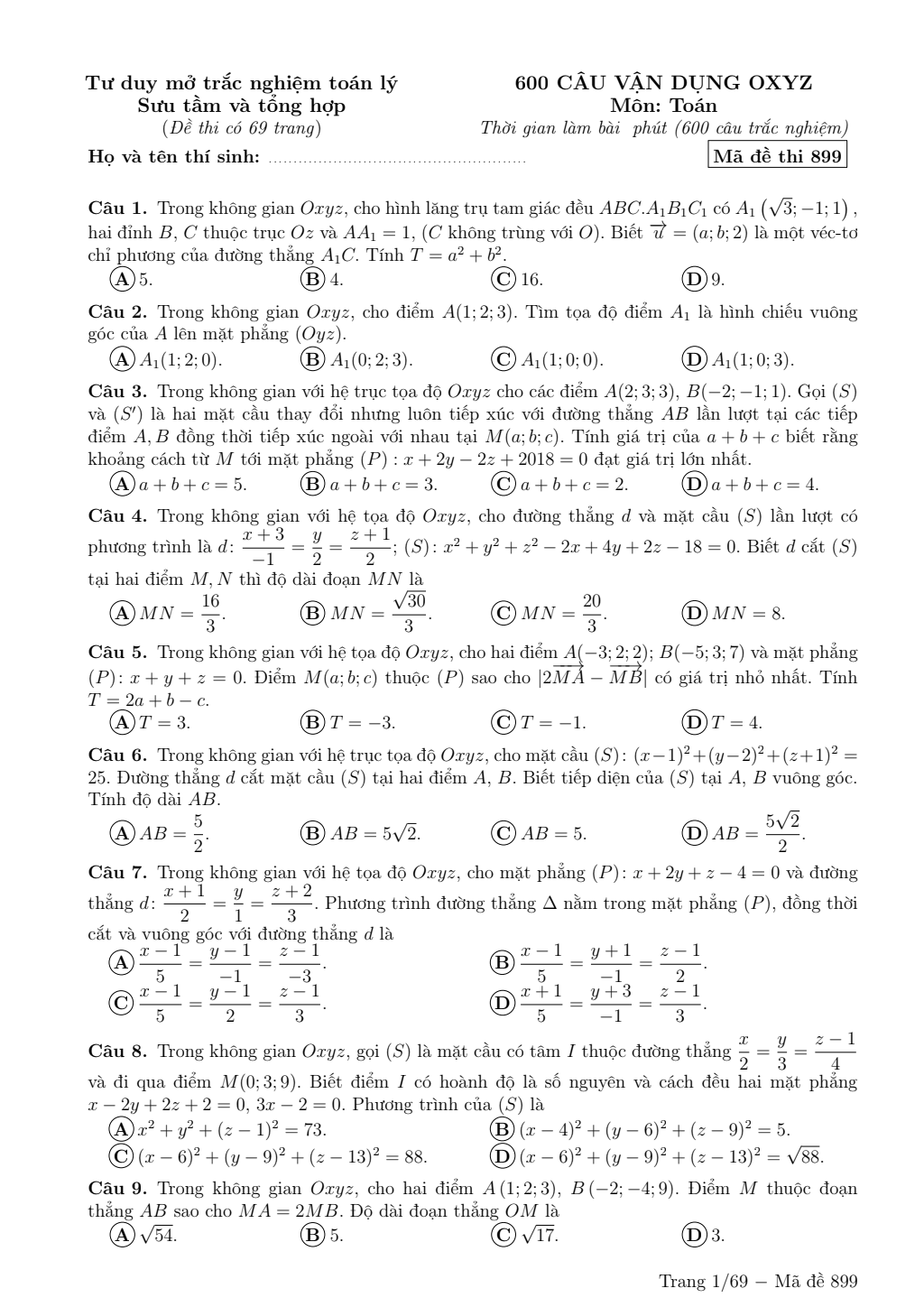 600 câu vận dụng cao phương pháp tọa độ trong không gian ôn thi THPT môn Toán