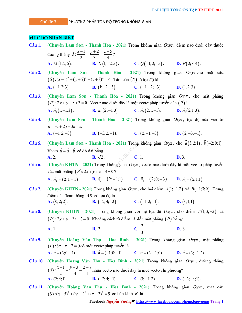 Tổng ôn tập TN THPT 2021 môn Toán-Phương pháp tọa độ trong không gian