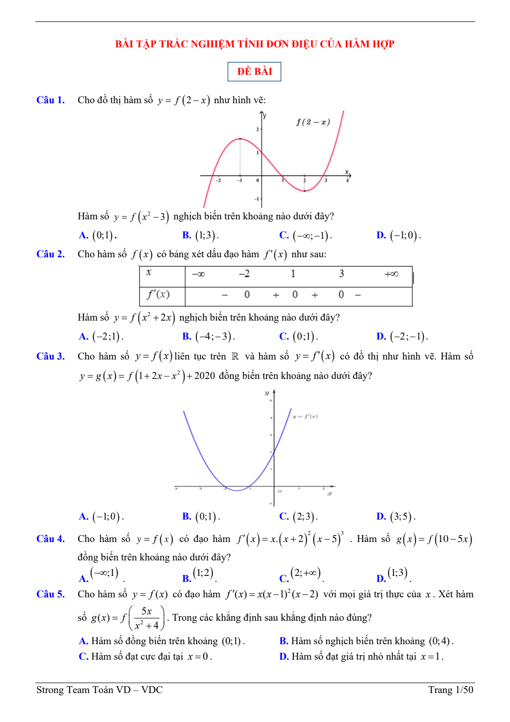 50 bài tập trắc nghiệm tính đơn điệu của hàm hợp có đáp án và lời giải