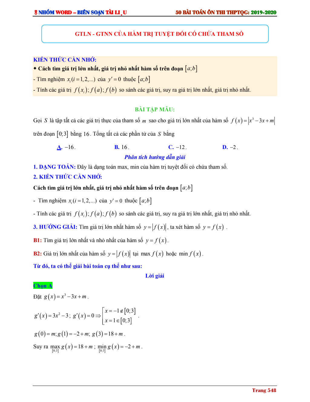 GTLN – GTNN của hàm trị tuyệt đối có chứa tham số