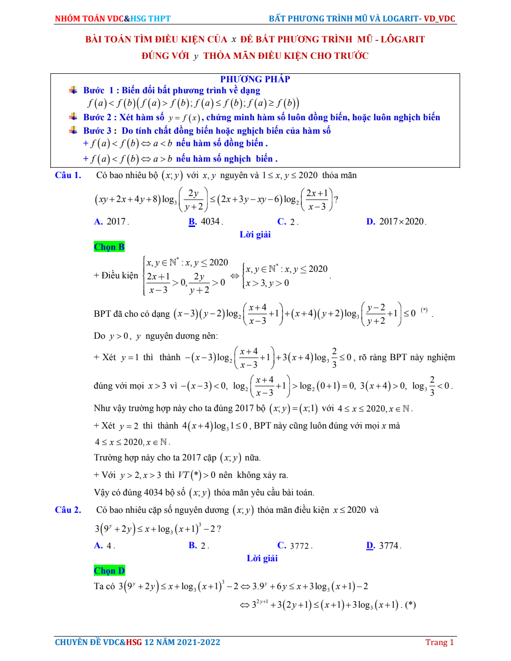 32 bài toán phương trình và bất phương trình mũ – logarit chứa tham số