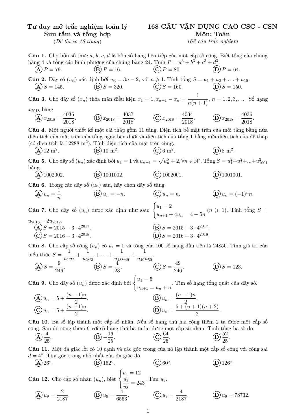 168 câu vận dụng cao dãy số, cấp số cộng và cấp số nhân ôn thi THPT môn Toán