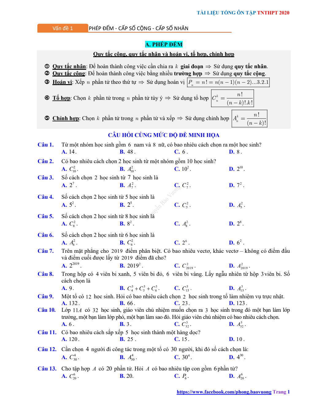 Tổng ôn tập TN THPT 2020 môn Toán- Phép đếm – cấp số cộng – cấp số nhân