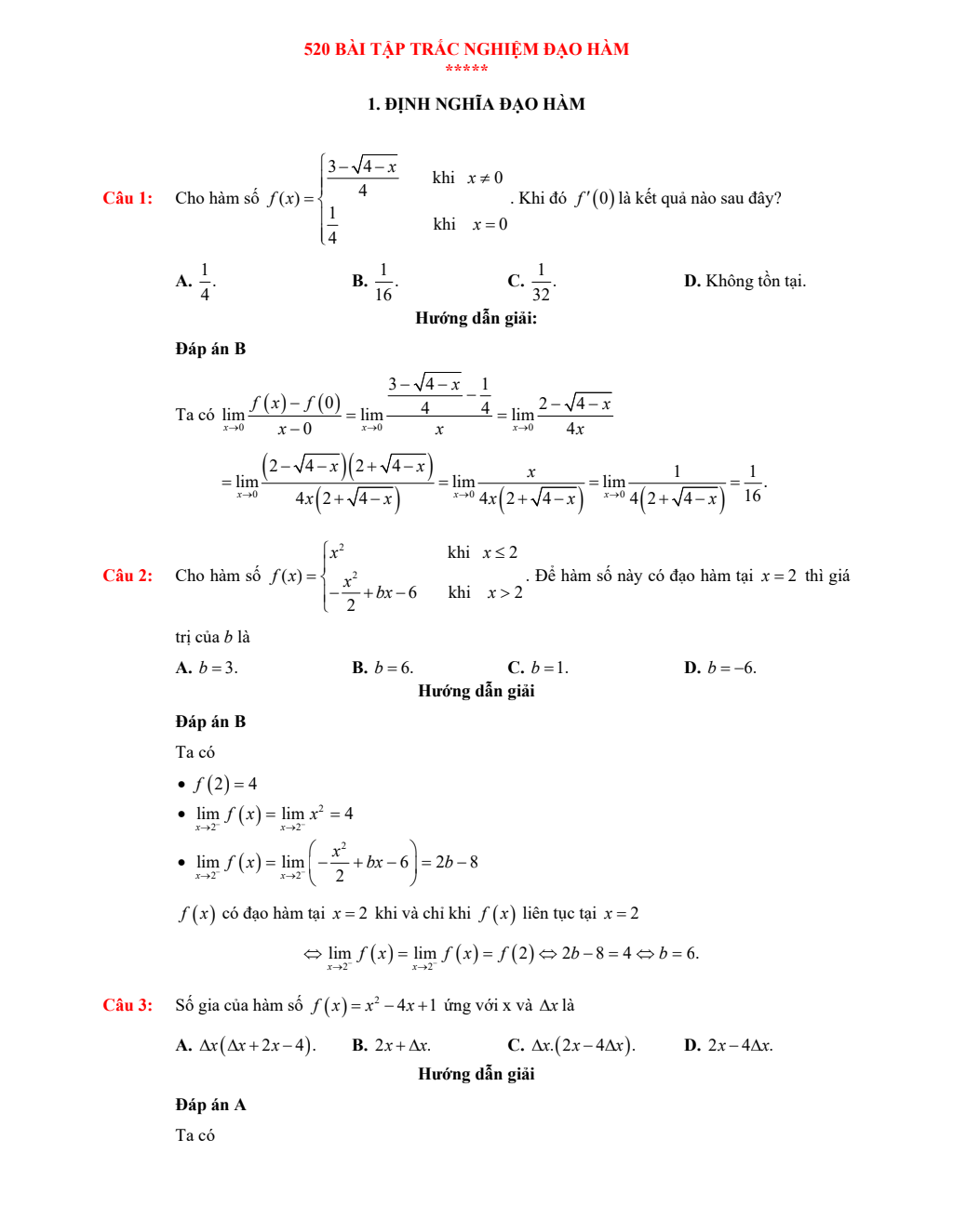 520 bài tập trắc nghiệm đạo hàm có đáp án và lời giải chi tiết Mới