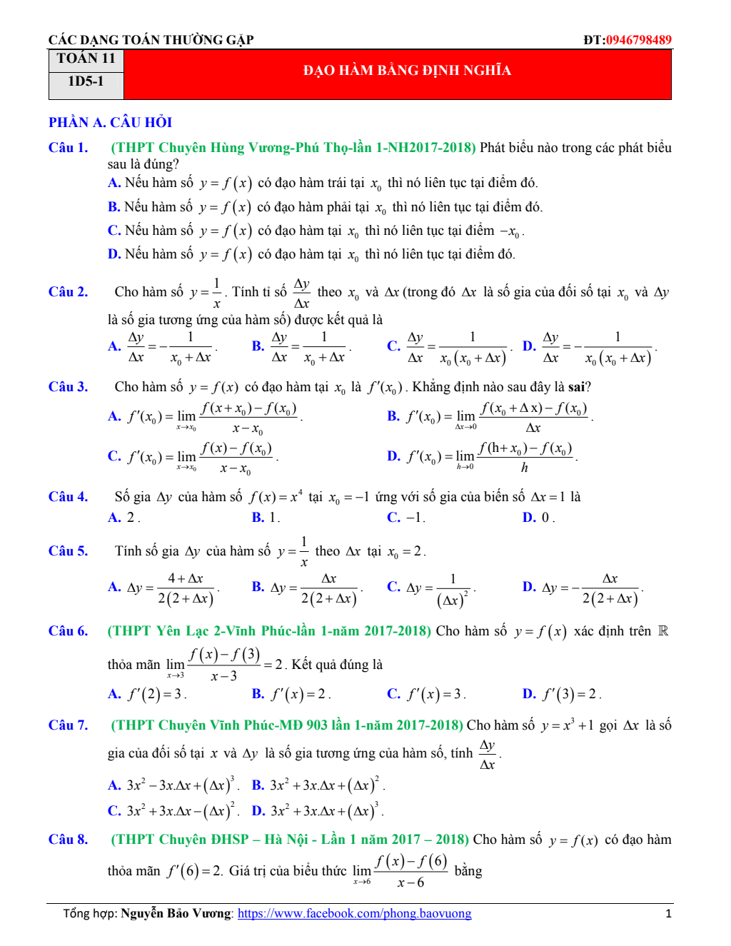 Các dạng toán trắc nghiệm đạo hàm thường gặp – Nguyễn Bảo Vương Mới