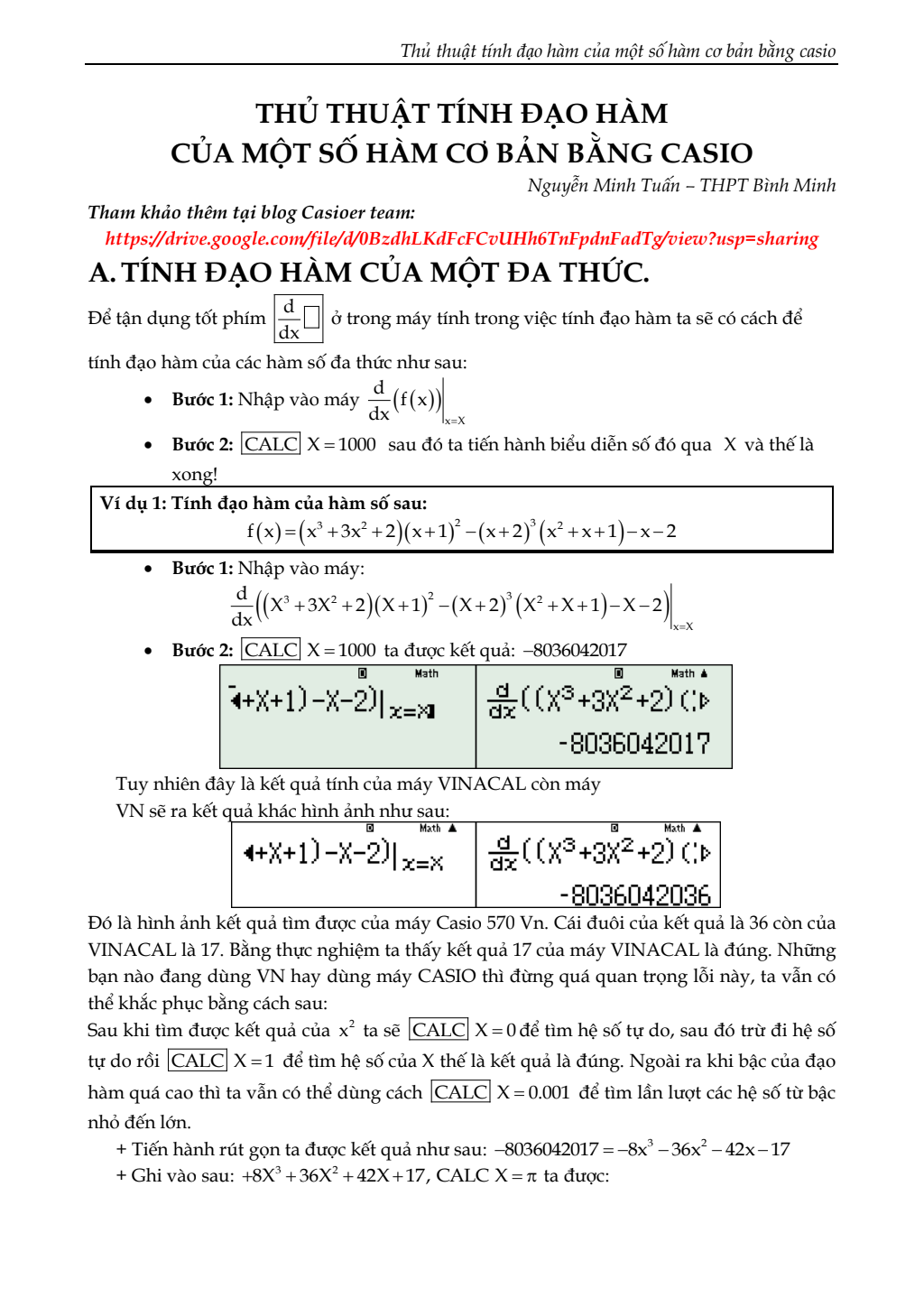 Thủ thuật tính đạo hàm của một số hàm cơ bản bằng Casio – Nguyễn Minh Tuấn Mới