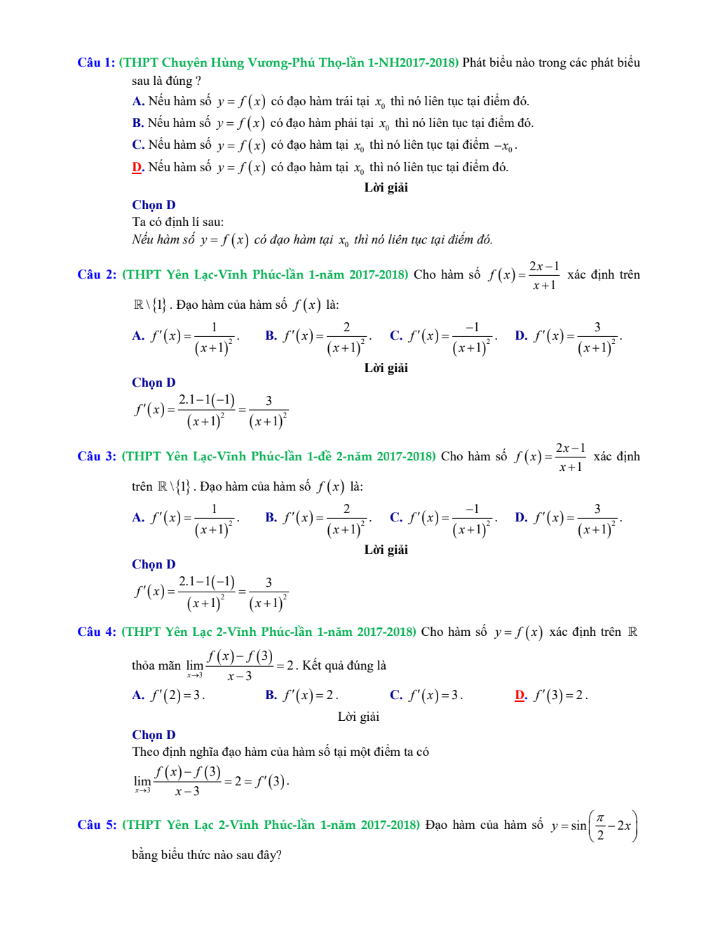 Trắc nghiệm đạo hàm có giải chi tiết trong các đề thi thử Toán 2018 Mới