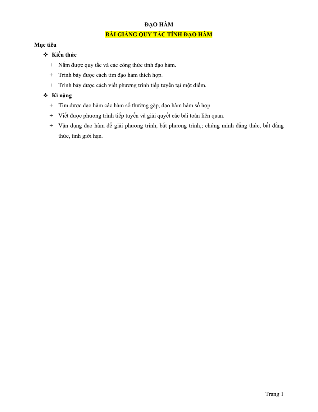 Bài giảng các quy tắc tính đạo hàm