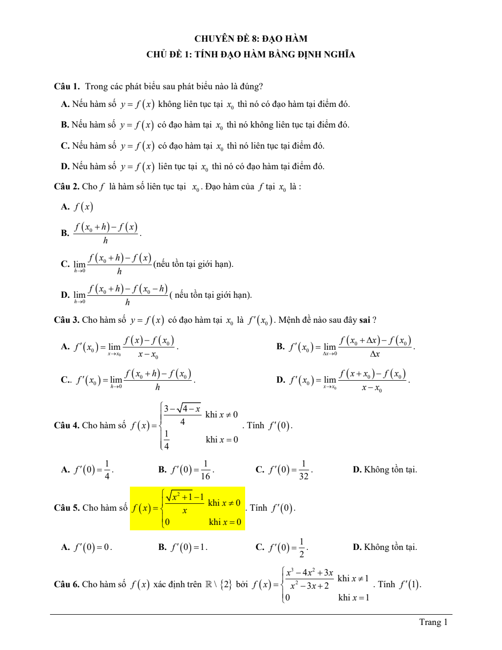 Hệ thống bài tập trắc nghiệm đạo hàm – vi phân