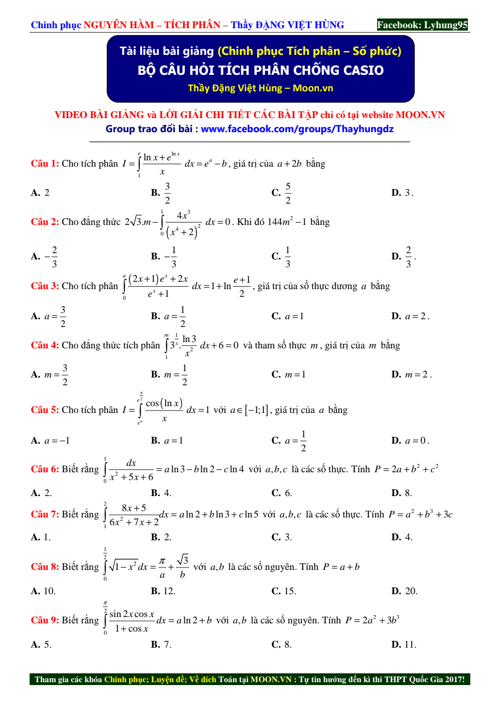 Bộ câu hỏi tích phân chống Casio có lời giải chi tiết – Đặng Việt Hùng Mới
