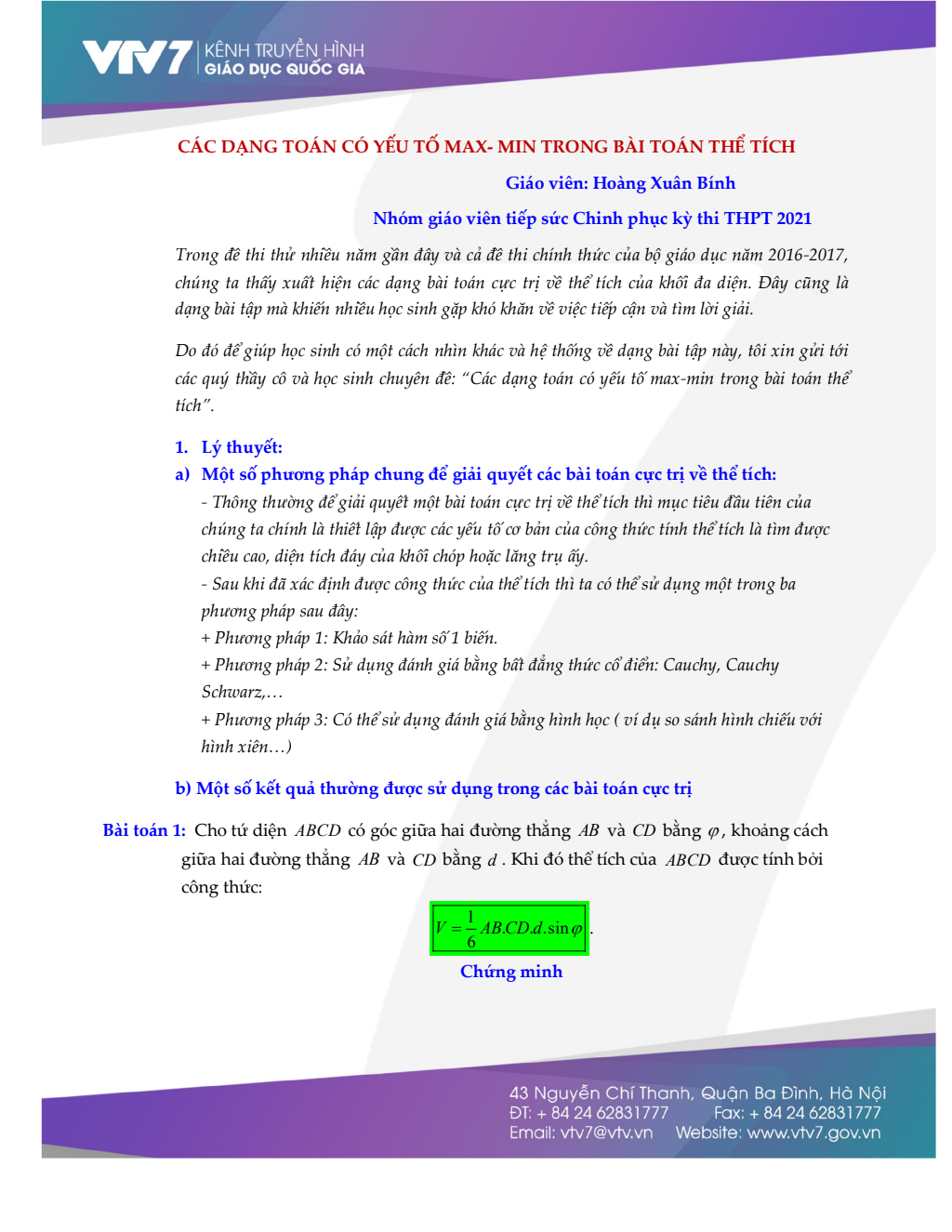 Tài liệu Các dạng toán có yếu tố max – min trong bài toán thể tích là tài liệu lý tưởng cho sinh viên muốn củng cố kiến thức và phát triển kỹ năng học tập