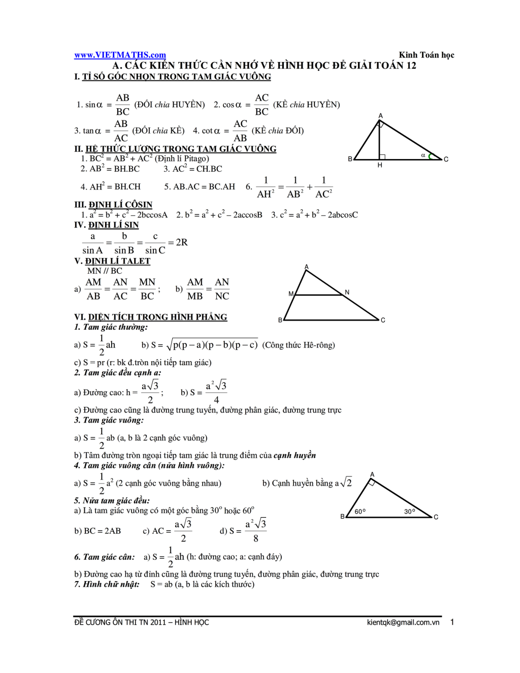 Các kiến thức cần nhớ về hình học để giải toán 12.pdf Mới